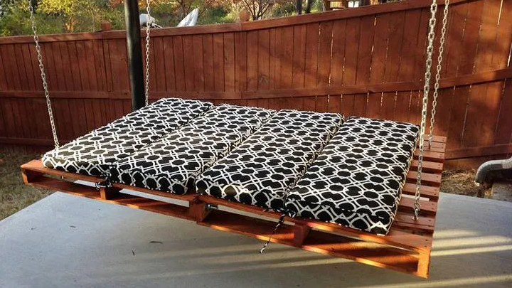 Na takovouto houpačku můžete totiž použít vyřazené pneumatiky, europalety, stará dřevěná křesla či dřevěné latě. Další potřebnou věcí s uskutečnění je lazurovací barva na dřevo (nebo barvu ve preji) , matraci, velkou spoustu polštářů a deky. K zavěšení už poté budete potřebovat pouze pevná lana či kovový řetěz a skoby.
